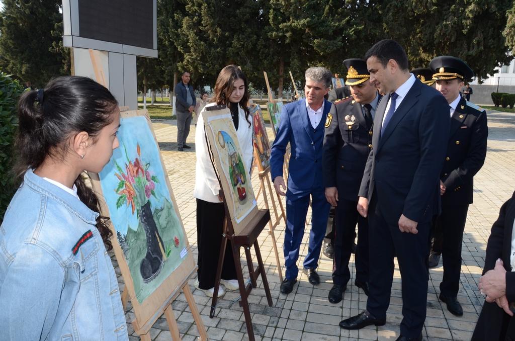 Daha sonra Heydər Əliyev meydanında Saatlı rayon Tarix-Diyarşünaslıq Muzeyinin direktoru Sürayyə Zeynalova, Saatlı rayon Dövlət Rəsm Qalereyasının rəssamı Nazim Fərəcovun və şagirdlərinin milli və vətənpərvər ruhda əl işlərindən ibarət rəsm sərgisinə baxış keçirilib.